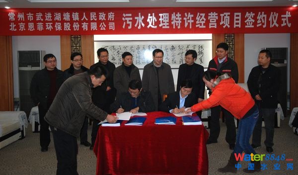 2012年1月10日下午,常州市武進(jìn)紡織工業(yè)園污水處理廠特許經(jīng)營(yíng)項(xiàng)目簽約儀式在武進(jìn)區(qū)湖塘鎮(zhèn)政府隆重舉行,湖塘鎮(zhèn)鎮(zhèn)長(zhǎng)吳琨與北京恩菲環(huán)保股份有限公司馬效賢總經(jīng)理簽訂了《常州市武進(jìn)紡織工業(yè)園污水處理廠項(xiàng)目特許經(jīng)營(yíng)協(xié)議》,湖塘鎮(zhèn)黨委書記黃劍明、副鎮(zhèn)長(zhǎng)賈國(guó)建及其他相關(guān)部門負(fù)責(zé)人和北京恩菲環(huán)保股份有限公司副總經(jīng)理何霖、運(yùn)營(yíng)部主任盧東昱等出席了簽約儀式。