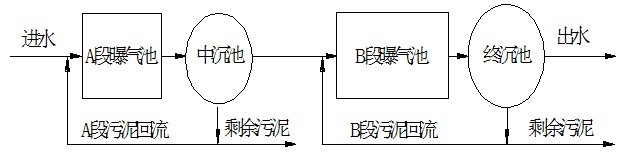 A-B法是吸附—生物降解法(Adsorption Bio-degradation)的簡稱,是德國亞琛大學Bbohnke教授于二十世紀七十年代中期開發(fā)的一種工藝,其生物反應池由A段和B段二級活性污泥系統串聯而成,A段和B段分別具有獨立的污泥回流系統。該工藝不設初沉池,但其A段對SS及BOD的去除率大大高于初沉池。A段負荷高,曝氣時間短,維持在極高的負荷下運行,使微生物處于快速增長期以發(fā)揮其對有機物的快速吸附作用;B段維持在較低的負荷下運行,利用長世代期微生物的作用,保持出水水質。