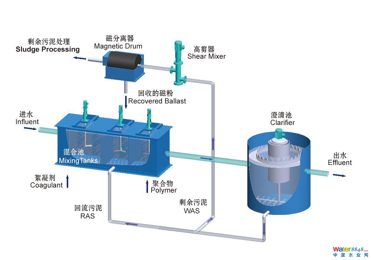 8、絮凝劑類型選擇靈活:CoMag工藝所用藥劑為常規(guī)絮凝劑,如硫酸鋁、氯化鐵、硫酸鐵或PAC等,選擇范圍廣泛,并可依據(jù)具體水質情況選擇最優(yōu)的絮凝劑進行添加。在確保處理效果良好的同時,還能進一步優(yōu)化其加藥量,保障運行成本的經(jīng)濟性。