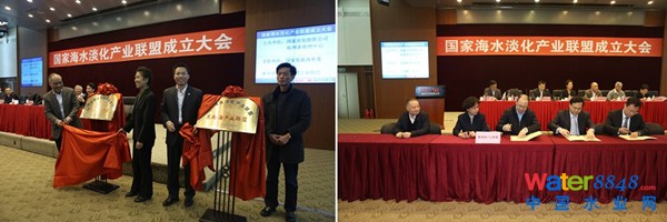 圖左:國家海水淡化產(chǎn)業(yè)聯(lián)盟揭牌儀式 圖右:海水淡化產(chǎn)業(yè)聯(lián)盟成員單位簽字儀式