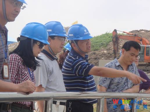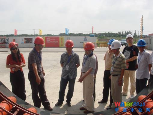 圖三:上海市排水公司副總經(jīng)理徐月江介紹施工情況(左四)