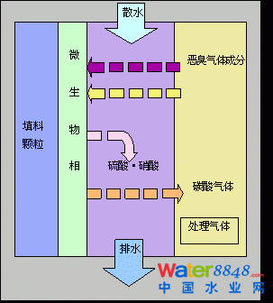 b.溶解于水中的惡臭成分被棲息于填料(生物媒)上的微生物吸收分解。