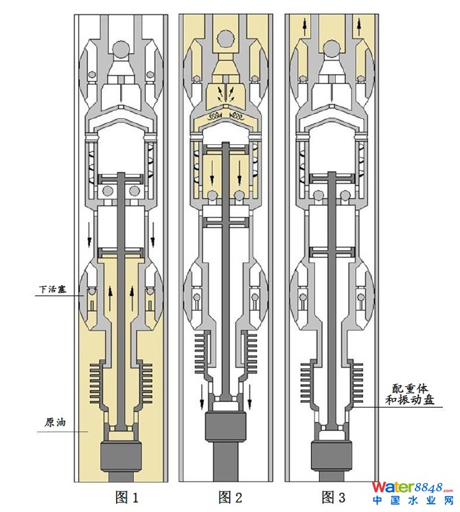 機(jī)械解堵采油器安裝在篩管下方,當(dāng)抽油機(jī)下沖程時(shí),油管柱彈性伸長(zhǎng),帶動(dòng)采油器向下移動(dòng),此時(shí),由于采油器的下活塞封堵了油套環(huán)形空間,采油器下移勢(shì)必?cái)D壓下部井液,迫使受壓井液通過(guò)下活塞的中心流道向上噴射,因此,配重體和振動(dòng)盤(pán)在這一反饋噴射沖擊力作用下向上移動(dòng),儲(chǔ)存重力勢(shì)能。上移至限位體時(shí)發(fā)生撞擊,產(chǎn)生振動(dòng)波(見(jiàn)圖1)。