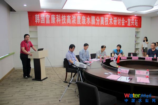 為了更好地幫助我市環(huán)保企業(yè)提高高濃度廢水處理能力,超越現(xiàn)有膜分離技術(shù)局限,同時實現(xiàn)企業(yè)經(jīng)濟利益的進一步提高,7月10日下午,江蘇省(宜興)環(huán)保產(chǎn)業(yè)研究院聯(lián)合韓國富康科技有限公司舉辦的“新一代高濃度廢水膜分離技術(shù)研討會”在研究院六樓會議室舉行。韓國富康科技有限公司膜研究所所長金樟圭、項目主管李龍、研究院執(zhí)行副院長徐榮攜全體工作人員出席了會議。百納、藍星、江華、瑞盛、博大、鼎澤、中冶冶化及無錫國聯(lián)等十二家環(huán)保企業(yè)的相關(guān)負責人也參加了研討會。