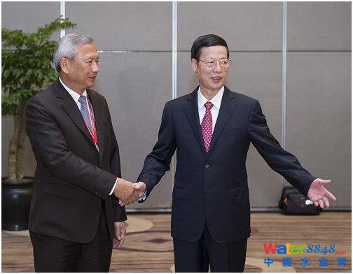 7月19日,中共中央政治局常委、國務(wù)院副總理張高麗在貴陽會見來華出席生態(tài)文明貴陽國際論壇2013年年會的泰國副總理兼商業(yè)部長尼瓦探隆。新華社記者 王曄 攝