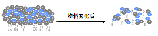 1) 采用二次切向內(nèi)混三流式氣流霧化技術(shù)。該技術(shù)可將粘度高達(dá)10萬厘泊的膏狀物料霧化成細(xì)小的霧滴,并且耗氣量。饬腺|(zhì)量比約1:10)、效率高,有效地解決了粘稠物料的霧化效果問題;
