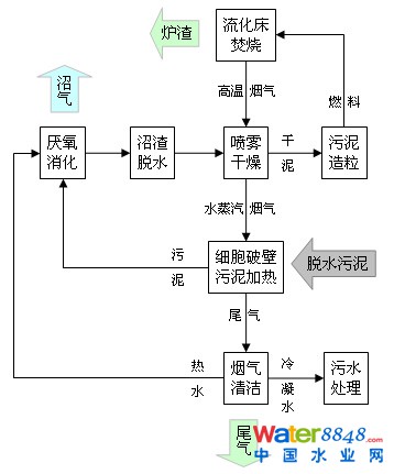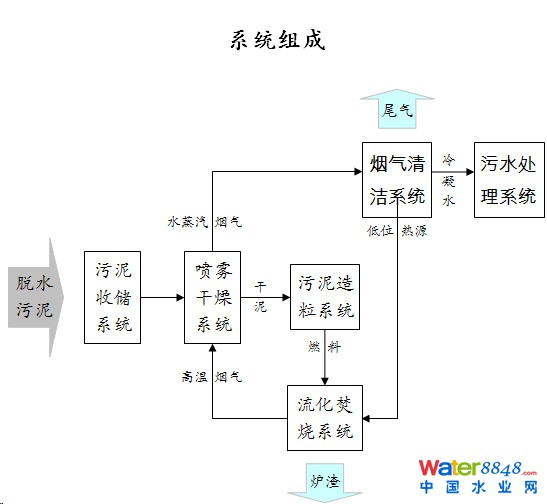 利用鋼鐵、水泥等工業(yè)的尾氣作為污泥噴霧干燥的熱源,構(gòu)成脫水污泥干化處理系統(tǒng)。
