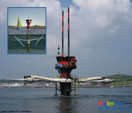 與風(fēng)力發(fā)電相類似,風(fēng)力帶動(dòng)渦輪旋轉(zhuǎn)產(chǎn)生電流,潮汐能發(fā)電用的也是流體的動(dòng)能,只不過(guò)它用的流體為潮汐流或洋流。裝機(jī)容量有1.2兆瓦的SeaGen電站,實(shí)際上它是由一對(duì)渦輪組成,每個(gè)渦輪直徑有66英尺長(zhǎng)(即20米),可以旋轉(zhuǎn)180度,維修時(shí)可以將它們提升至水面上。小插圖是正常工作情況下的渦輪。