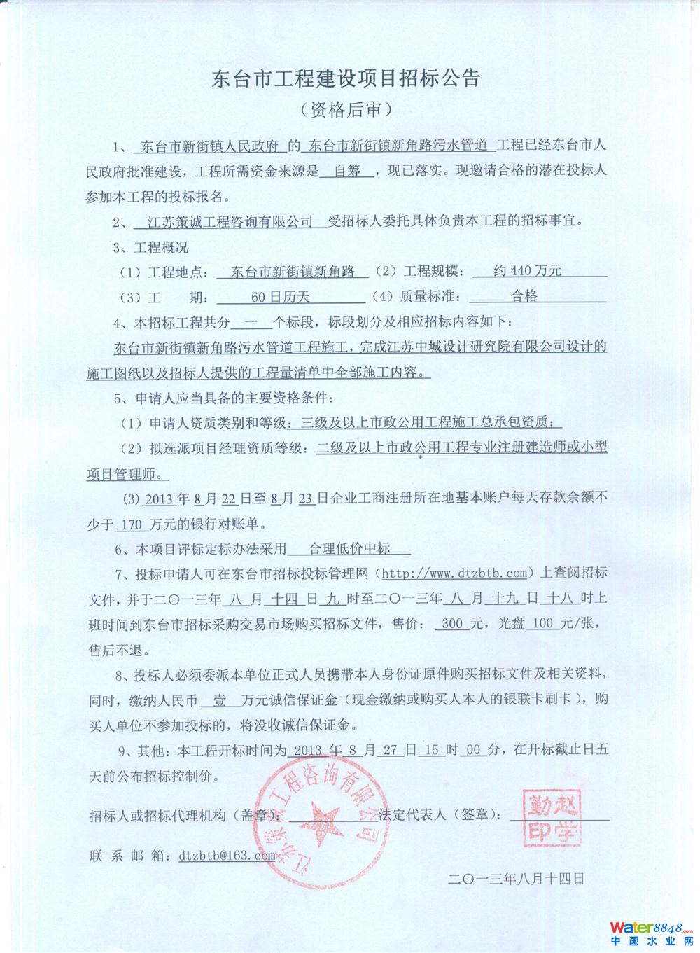 江蘇東臺(tái)市新街鎮(zhèn)新角路污水管道工程招標(biāo)公告