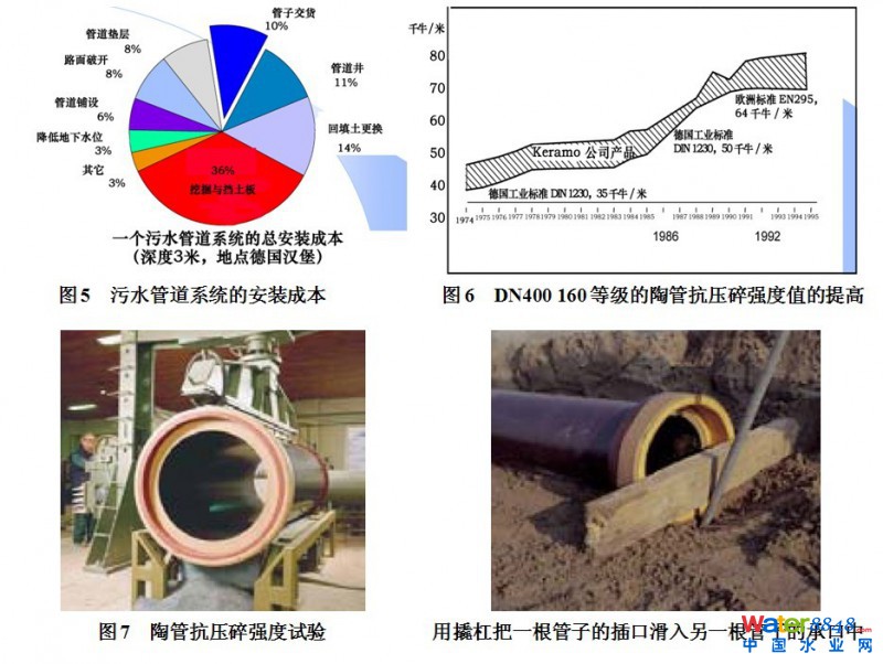 世界上發(fā)達(dá)國家開發(fā)現(xiàn)代化高強(qiáng)度帶優(yōu)質(zhì)柔性密封的陶管生產(chǎn)技術(shù),歐洲十八個國家共同采用EN 295標(biāo)準(zhǔn)的嚴(yán)格要求,進(jìn)行陶管生產(chǎn)。分別采用歐洲標(biāo)準(zhǔn)EN1610:1998和EN12889:2000用于下水管道污水管道開挖施工,非開挖施工和相應(yīng)的驗(yàn)收試驗(yàn)。歐洲德國Steinzeug-Keramo公司年生產(chǎn)陶管能力達(dá)35萬噸,全部生產(chǎn)由計(jì)算機(jī)、機(jī)器人操作。德國公用和私人下水管道總長度的46%為陶管,德國的慕尼黑(1811)、漢堡(1842)、法蘭克福(1867)、史泰琴(1868)、但澤(1871)、柏林(1873)、布雷斯勞(1877)、科。1881)和杜賽爾多夫(1884)等城市使用陶管作下水管道達(dá)百年以上。杜賽爾多夫城市污水管理部門在管道使用一百年完全折舊后,又延長了其使用期30年,從而大大減輕了用戶對污水處理的負(fù)擔(dān)。美國使用陶管污水管道百年以上的城市達(dá)47個。最古老的屬華盛頓特區(qū)(1815年鋪設(shè))。英國使用陶管作污水管道百年以上的城市有7個。中國的天津、上海、青島、武漢等城市使用陶管也有百年以上。這里還指的是傳統(tǒng)的陶管,現(xiàn)代化陶管的壽命會更高。