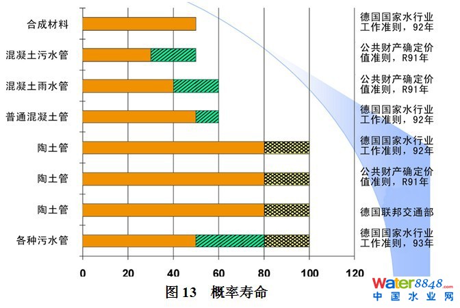 考慮陶管的很長的概率壽命,適度超出的費(fèi)用會很容易地被視為合理。即使在對污水管道付出很大關(guān)注和資源的城鎮(zhèn)來說,歷史告訴我們一條污水管道很少會在兩代人的時段進(jìn)行更新,除非它的狀況會造成一個真正的危險(xiǎn)。所以更現(xiàn)實(shí)的選擇是讓一條下水管道有80年到100年的時間內(nèi)有良好的狀況。按這一正確的觀點(diǎn)也可以很容易地論證出陶管是最好的選擇。用根據(jù)LAWA(德國公共財(cái)產(chǎn)確定價值準(zhǔn)則)的計(jì)算方法,取始終如一的折舊,利息,考慮重新投資和資金折現(xiàn)化,結(jié)果顯示如果選取與長期概率壽命有關(guān)的陶管的數(shù)值,就會取得很高的性/價比值。