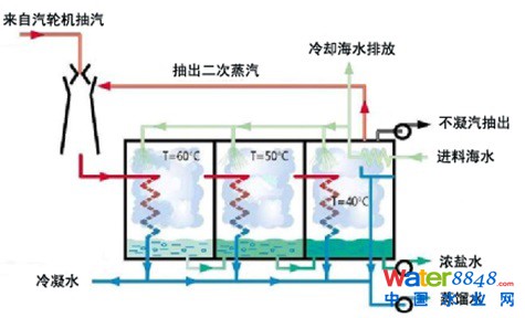 順流進料方式還需要采用中間進料泵來實現(xiàn)各級物料海水的均勻噴淋,這樣就增加了系統(tǒng)的復(fù)雜性與泵功的消耗。目前,也有采用塔式布置來省去中間進料泵的環(huán)節(jié),但目前塔式常應(yīng)用于小型海水淡化項目。