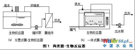 根據(jù)膜組件的設(shè)置位置,膜-生物反應(yīng)器可分為分置式膜-生物反應(yīng)器(sidestream MBR)和一體式膜-生物反應(yīng)器(submerged MBR)兩大類,如圖1所示。
