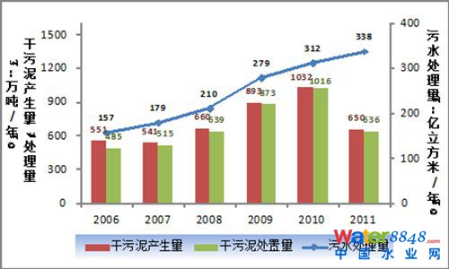 圖 1 全國(guó)城市污水處理廠干污泥產(chǎn)生量、處理量(2006-2011)