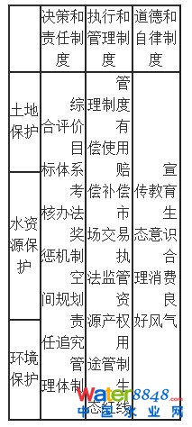 這3類任務(wù)適用于耕地保護(hù)、水資源保護(hù)、環(huán)境保護(hù)等多個(gè)領(lǐng)域,由此,可以得到一個(gè)生態(tài)文明制度的矩陣(見下圖)。