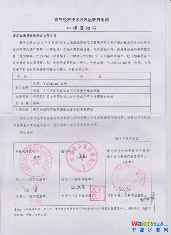 來(lái)自國(guó)內(nèi)的上海實(shí)力機(jī)電、常州天興環(huán)保、江蘇純江環(huán)保和青島金海晟等公司共同參與了該項(xiàng)目的投標(biāo)活動(dòng)。經(jīng)過(guò)專家小組的統(tǒng)一論證,我公司以優(yōu)良的設(shè)備、突出的特性、合理的價(jià)格、誠(chéng)懇的服務(wù),得到專家小組的一致好評(píng)。專家小組推薦我公司為第一候選人,并報(bào)經(jīng)市政府采購(gòu)中心批準(zhǔn),確定青島金海晟環(huán)保公司為中標(biāo)人。