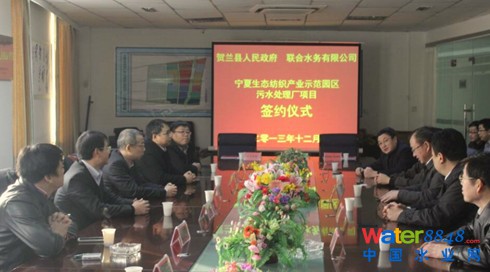 2013年12月27日上午,聯(lián)合水務(wù)有限公司與寧夏回族自治區(qū)賀蘭縣人民政府舉行了寧夏生態(tài)紡織示范園區(qū)污水處理項目的簽約儀式。
