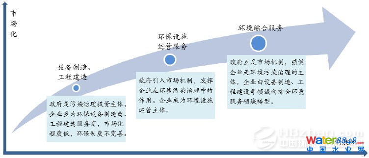 環(huán)境污染第三方治理和合同環(huán)境服務等模式是環(huán)保行業(yè)市場化的主要表現(xiàn)形式。十八屆三中全會對生態(tài)文明制度體系建設的部署中明確提出,要建立吸引社會資本投入生態(tài)環(huán)境保護的市場化機制,推行環(huán)境污染第三方治理。第三方治理將專業(yè)化、資質(zhì)齊全的環(huán)境污染治理企業(yè)以市場化方式引入環(huán)境污染治理領域,可以使污染治理相對集中,減少環(huán)保基礎設施的重復投資,降低治理成本,同時權責明晰,便于環(huán)保部門的監(jiān)管。