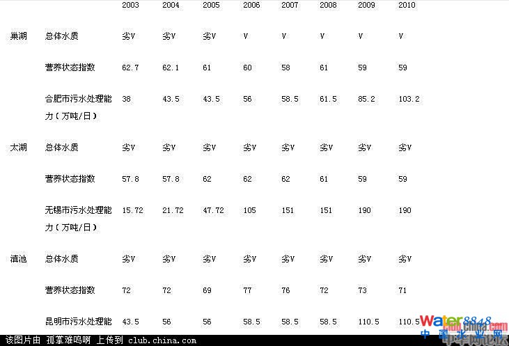 為治理太湖無錫市的污水處理能力從2003年的15.7萬(wàn)噸/天增大至2009年的190萬(wàn)噸/天,執(zhí)行一級(jí)A標(biāo)準(zhǔn),到2010年太湖的總體水質(zhì)依然是劣V類,營(yíng)養(yǎng)狀態(tài)指數(shù)2003年是57.8,以后數(shù)年反而升至62,2004-2011年8年的平均值是60.2,較2003年上升2.4%。