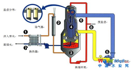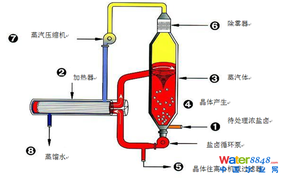 零排放技術(shù)利用蒸發(fā)方式從廢水中去除溶解性固體,并將蒸餾水經(jīng)過凈化和處理后可直接循環(huán)使用,不需要將水再排入河道或海洋。反滲透可用作預(yù)處理來濃縮廢水,濃縮后剩余水量需要蒸發(fā),大多數(shù)情況下,機(jī)械蒸汽在壓縮蒸發(fā)器在結(jié)晶前用作進(jìn)一步濃縮鹽水,循環(huán)后冷凝水可回用于工廠工藝段,實現(xiàn)廢水零排放。固體回用于工業(yè)原料和填埋。