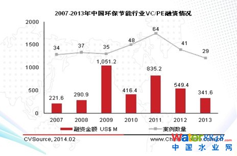 2013年我國環(huán)保節(jié)能行業(yè)共披露融資案例29起,融資總額為3.42億美元,數(shù)量和金額同比分別下降29.3%以及37.8%,創(chuàng)下近五年新低。
