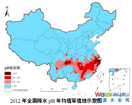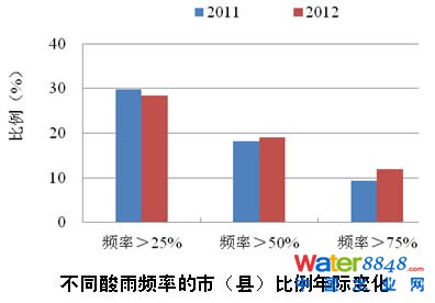 2012年出現(xiàn)酸雨的市(縣)占46.1%;酸雨頻率在25%以上的133個(gè),占28.5%;酸雨頻率在75%以上的56個(gè),占12.0%。全國(guó)酸雨分布區(qū)域主要集中在長(zhǎng)江沿線及以南–青藏高原以東地區(qū)。酸雨區(qū)面積約占國(guó)土面積的12.2%。