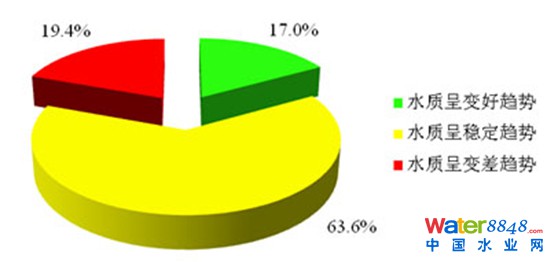 與上年相比,地下水水質(zhì)呈變好趨勢(shì)的占17.0%,穩(wěn)定趨勢(shì)的占63.6%,變差趨勢(shì)的占19.4%。