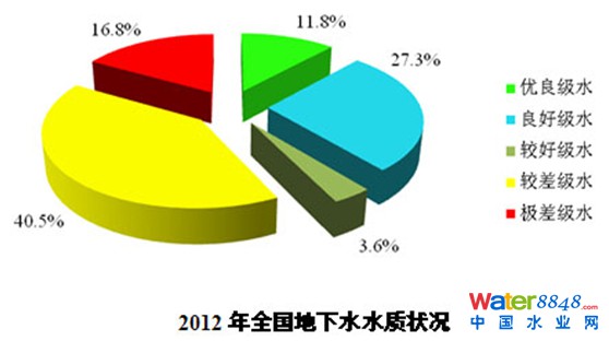 地下水環(huán)境質(zhì)量觀察點(diǎn)中,較差和極差的占有很高比例。2012年,全國(guó)地下水水質(zhì)監(jiān)測(cè)中,水質(zhì)呈優(yōu)良級(jí)的占11.8%;良好級(jí)的占27.3%,較好級(jí)的占3.6%,較差級(jí)的占40.5%,極差級(jí)的占16.8%。