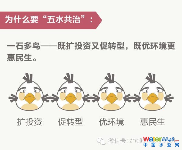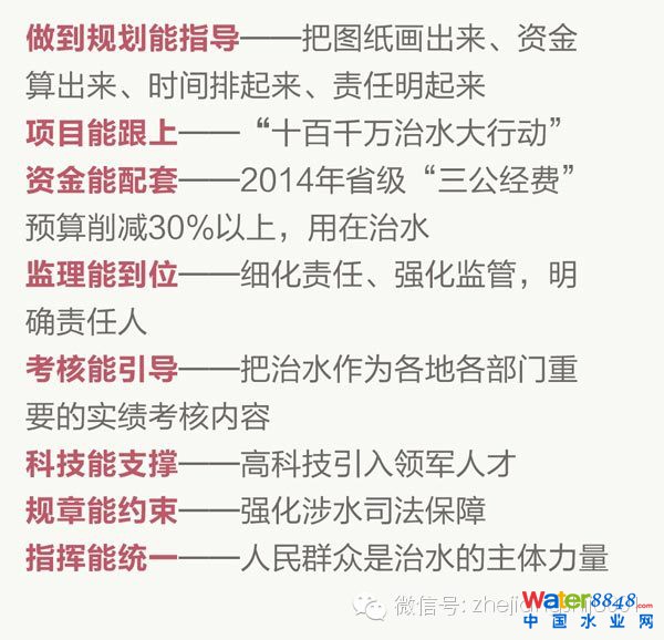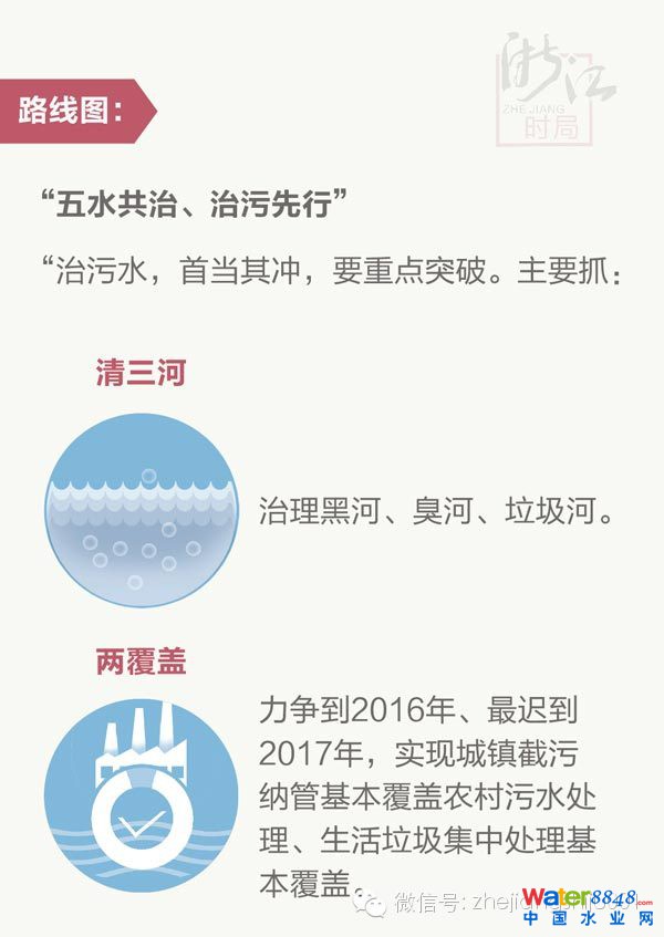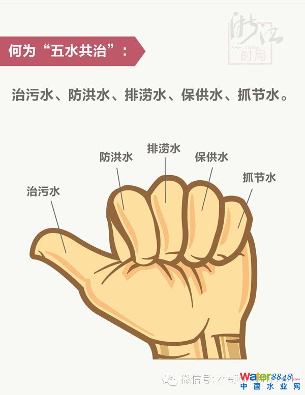 五水共治,好比五個(gè)手指,治污水是大拇指,防洪水、排澇水、保供水、抓節(jié)水是其他四指,分工有別,和而不同,捏起來(lái)就是一個(gè)拳頭。治污水的大拇指最粗,百姓觀感最直接,也最能帶動(dòng)全局,最能見效。治好污水,百姓必會(huì)豎起大拇指。為此,省委省政府特地繪出了浙江“五水共治,治污先行”的路線路——