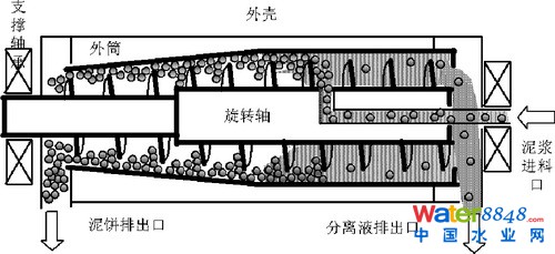 (1)沉降式離心機(jī):如圖1所示,在一個(gè)旋轉(zhuǎn)的圓簡形容器中,泥漿中固體顆粒將受到比重力大很多倍離心力的作用,使得比液體密度大的固體顆粒沿半徑向旋轉(zhuǎn)的四壁移動(dòng)沉積,如四壁是開孔的或是可滲透的,液體穿過沉積的固體顆粒和四壁而排出,從而達(dá)到固液分離的目的。淤泥經(jīng)脫水以后含水率在(1.0~1.2)wL左右。日本采用的沉降式離心機(jī)每小時(shí)處理100m3,有的場合可以少用藥劑或者不用藥劑,轉(zhuǎn)速3000r/min左右。
