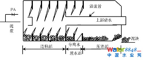 (2)水中造粒機(jī):如圖2所示,泥漿和藥劑混合后形成疏散絮體,在造粒機(jī)和重力作用下,讓其沿曲面滾動(dòng)、碰撞、移位、產(chǎn)生剪切力,受到各種不均勻的作用,迫使水分從疏散的絮體中分離出來,使絮凝物如滾雪球一樣,逐漸加大,成為密實(shí)體,形成年輪結(jié)構(gòu),從而完成泥水分離。淤泥經(jīng)脫水以后含水率在(0.7~0.8)wL左右。日本、美國采用的水中造粒機(jī)每小時(shí)處理30m3,電耗在各類脫水機(jī)中最低,轉(zhuǎn)速1~2r/min。