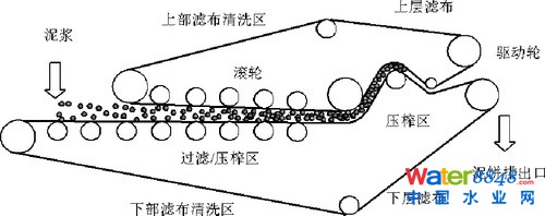 (4)帶式壓濾機(jī):如圖4所示,利用濾布的張力和壓力在濾布上對(duì)添加過藥劑的淤泥施加壓力使其脫水。淤泥經(jīng)脫水以后含水率在1.0wL左右。瑞典采用的2.6m寬的帶式壓濾機(jī)每小時(shí)處理60m3,日產(chǎn)泥餅264t。