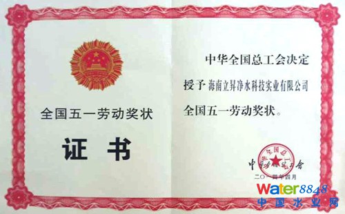 2014年全國(guó)五一勞動(dòng)獎(jiǎng)表彰大會(huì)4月30日在海口舉行,全國(guó)總工會(huì)授予海南省本土企業(yè)立昇公司“五一勞動(dòng)獎(jiǎng)狀”。據(jù)了解,公司董事長(zhǎng)陳良剛曾在2009年獲得全國(guó)五一勞動(dòng)獎(jiǎng)?wù)聜(gè)人獎(jiǎng)。此次再獲獎(jiǎng),立昇成為水行業(yè)在該獎(jiǎng)項(xiàng)上首個(gè)實(shí)現(xiàn)“大滿貫”的企業(yè)。