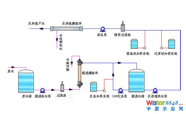 雙膜法工藝的核心技術(shù)是連續(xù)超濾(CUF)+反滲透(RO),由超濾前處理、超濾單元、反滲透單元、加藥單元、化學(xué)清洗單元、自控單元等部分組成,最終可去除水中的無(wú)機(jī)鹽、有機(jī)物和微生物等。采用超濾作為反滲透的預(yù)處理,有效去除水中的懸浮物、膠體、有機(jī)物等,保證反滲透膜前進(jìn)水水質(zhì),有利于反滲透膜的長(zhǎng)期、穩(wěn)定運(yùn)行,延長(zhǎng)反滲透膜的使用壽命。