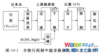 表10-2中所列污泥成分表明,電鍍含鉻廢水經(jīng)處理(電解法、鐵氧體法、硫酸亞鐵還原法)后所產(chǎn)生的污泥,其Cr203和Fe203所占百分比符合B104型中變催化劑原料的化學(xué)成分,只需補(bǔ)充K20、MgO,即可滿足B104中變催化劑生產(chǎn)的需要。污泥經(jīng)洗滌、過(guò)濾,再與助催化劑KOH、MgO混碾均勻,經(jīng)120℃烘干,加石墨10%壓片,再經(jīng)350℃焙燒即可制成中變催化劑。這種利用含鉻含鐵污燒即可制成中變催化劑。這種利用含鉻含鐵污泥制成的催化劑,無(wú)論是CO的轉(zhuǎn)化率和機(jī)械強(qiáng)度等技術(shù)指標(biāo),均滿足國(guó)家規(guī)定的產(chǎn)品要求。但這種催化劑不適于用天然氣作為原料的合成氨工藝。