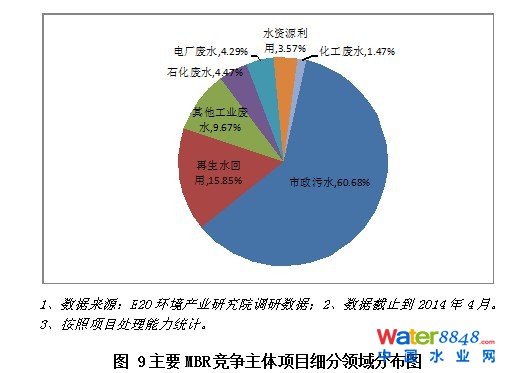 根據(jù)E20環(huán)境產(chǎn)業(yè)研究院《中國(guó)MBR市場(chǎng)調(diào)研分析報(bào)告(2014版)》,調(diào)研的13家主要MBR企業(yè)100余個(gè)萬(wàn)噸級(jí)以上MBR項(xiàng)目,按照處理能力統(tǒng)計(jì),市政領(lǐng)域項(xiàng)目(包含再生水回用和水資源利用)占比為80.10%,工業(yè)廢水占比為19.90%。下圖列出了更為詳細(xì)的細(xì)分領(lǐng)域項(xiàng)目占比情況,從圖中可以看出,市政污水項(xiàng)目占比最高,達(dá)60.68%,其次為再生水回用項(xiàng)目,占比為15.85%。工業(yè)廢水領(lǐng)域中,石化廢水占比最高,達(dá)4.47%,其次為電廠廢水,達(dá)4.29%。