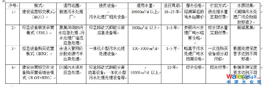 合同環(huán)境服務(wù)是政府職能轉(zhuǎn)變的先進生產(chǎn)力模式,政府提供一定的特許條件,將環(huán)境治理設(shè)施建設(shè)、生產(chǎn)管理、運營服務(wù)等責(zé)任轉(zhuǎn)移給專業(yè)企業(yè),只專注購買服務(wù)結(jié)果。污水處理廠大規(guī)模的BOT即屬于這種模式,目前已成主流,同時企業(yè)的環(huán)境污染治理也在試驗這種模式,專業(yè)化發(fā)展?jié)摿薮。但對于黑臭河、河湖水環(huán)境應(yīng)急處理卻沒有完整的商業(yè)模式,這部分污染不是15~30年投資分攤的BOT模式,而是1~5年的應(yīng)急處理模式,目前狀況要么政府不作為,要么政府直接賣單;針對水污染應(yīng)急處理需求,急需新的商業(yè)模式來滿足政府和企業(yè)處理處置該項任務(wù),應(yīng)急合同環(huán)境服務(wù)顯得迫切需要。