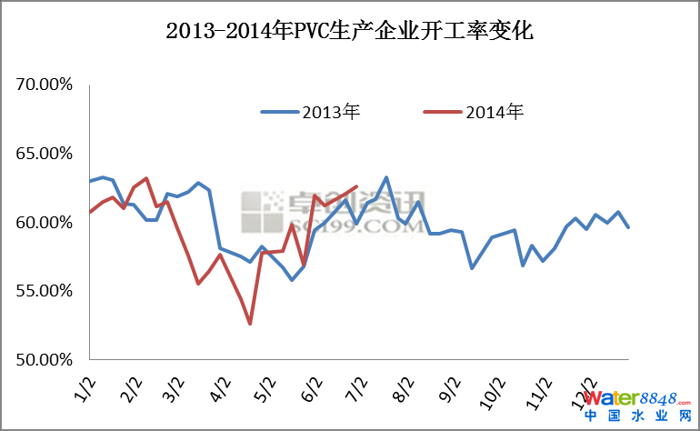 供大于求的現(xiàn)狀下,2014年我國PVC企業(yè)整體開工率依舊不高,1-6月份平均開工率不足60%,低于去年同期60.81%的水平。年初為迎接新的開始,我國PVC企業(yè)開工率不管是環(huán)比還是同比都維持慣性提升。然而,在國內(nèi)經(jīng)濟形勢疲軟、樓市不景氣的陰影下,2014年需求不及預(yù)期,PVC價格持續(xù)下跌,供應(yīng)壓力日益凸顯,導(dǎo)致PVC裝置檢修期提前到來,開工負(fù)荷自3月份開始環(huán)比陸續(xù)回落。1-2月份PVC平均開工率為61.71%,而3-4月的平均開工率僅有56.9%。到5月中旬,隨檢修企業(yè)的陸續(xù)恢復(fù)及后續(xù)檢修企業(yè)的減少,整體開工陸續(xù)提升,到6月份PVC平均開工率提升至61.95%。