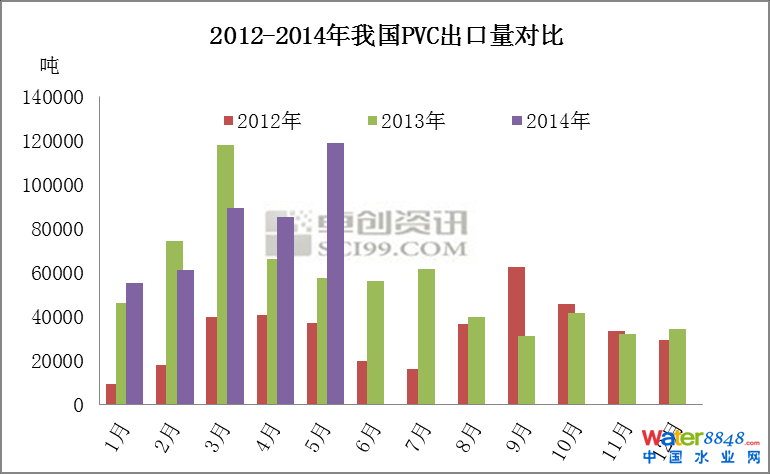2014年在國內(nèi)PVC市場競爭更加激烈的情況下,我國PVC供應(yīng)商繼續(xù)積極擴大海外市場以緩解銷售壓力,同時希望取得更好的利潤收入,從而彌補國內(nèi)價格低位運行帶來的長期虧損。2014年我國PVC出口依舊保持良好的增長態(tài)勢,1-5月累計出口量40.92萬噸,比去年同期增加11.32%。