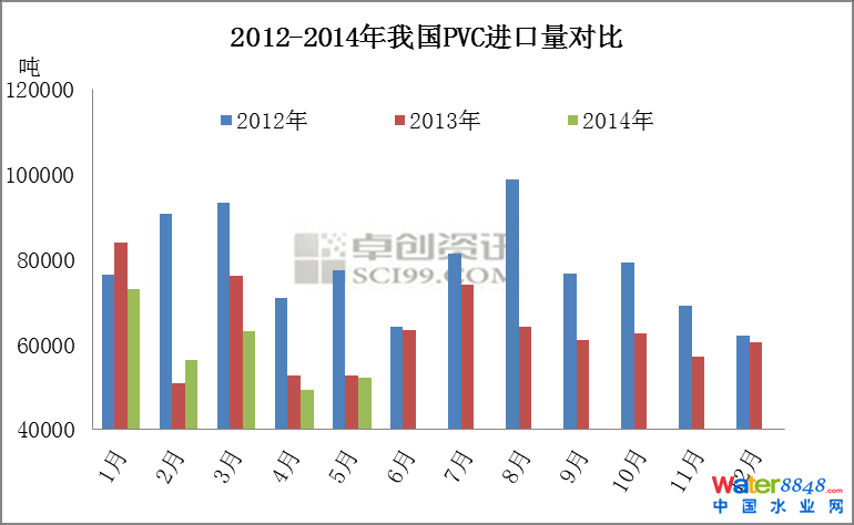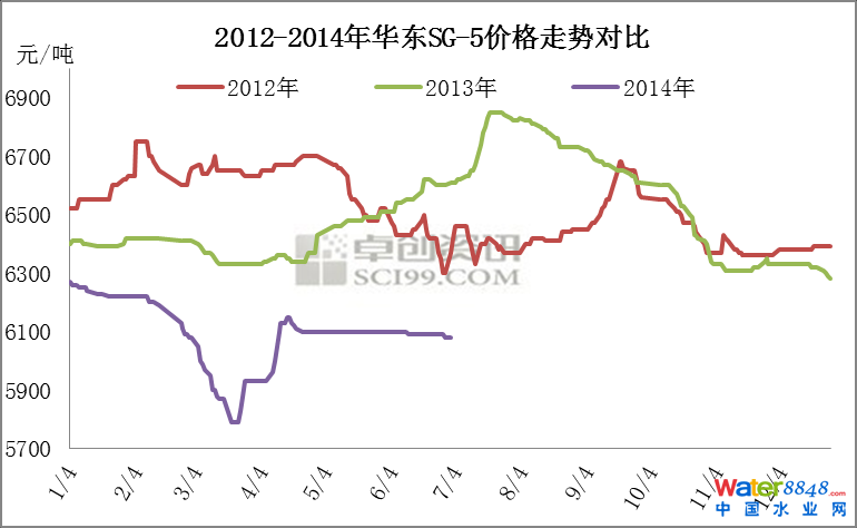 2014年上半年P(guān)VC市場表現(xiàn)異常低迷,一季度價格跌跌不休,二季度經(jīng)過短暫反彈后長期僵持盤整,據(jù)卓創(chuàng)資訊統(tǒng)計數(shù)據(jù)顯示,上半年華東SG-5均價6092元/噸,同比去年6423元/噸的均價低331元/噸。具體行情表現(xiàn)為,經(jīng)過春節(jié)假期的影響,一月份庫存壓力急劇增加,春節(jié)過后PVC市場呈現(xiàn)去庫存化的過程,由于去年新增產(chǎn)能較多,2014年產(chǎn)量大幅增加,所以一季度的去庫存化表現(xiàn)的尤為緩慢,巨大的供應(yīng)壓力揮之不去,另外由于國內(nèi)經(jīng)濟下行壓力巨大, 房地產(chǎn)市場出現(xiàn)轉(zhuǎn)弱。在多重利空影響下PVC跌跌不休,截至3月下旬華東SG-5價格回落至5790元/噸,此價創(chuàng)下5年來最低位。隨著三月底市場庫存的逐步消化以及PVC企業(yè)集中檢修期提前,PVC市場供應(yīng)壓力明顯減少,二季度初PVC市場開始觸底反彈,短短半個月的時間華東SG-5均價反彈至6150元/噸,較三月底低價漲360元/噸,4月下旬至6月底PVC市場處于弱勢平衡狀態(tài),市場貨源偏少,下游需求清淡,價格持續(xù)持穩(wěn)。