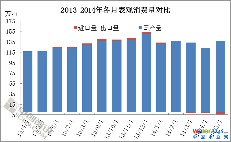 雖然樓市不景氣影響,上半年不管是型材還是管材行業(yè)開工率同比均出現(xiàn)下降。卓創(chuàng)統(tǒng)計數(shù)據(jù)顯示2014年上半年型材制品企業(yè)謹(jǐn)整體開工較去年同期低10%-20%;管材制品企業(yè)開工同比去年有10%左右的下降。但2014年制品產(chǎn)能基數(shù)較大,2014年1-5月份國內(nèi)的塑料制品累計總產(chǎn)量在2763.2萬噸,較2013年同期增長7.5%。2014年1-5月我國PVC累計表觀消費量為654.37萬噸,累計同比增加10.3%。