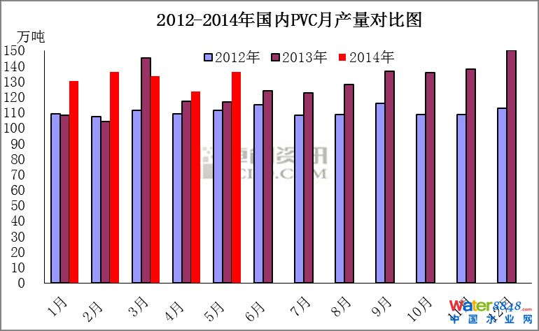 雖然2014年上半年我國PVC開工率低于去年同期,但供應(yīng)壓力增加,2014年1-5月份累計產(chǎn)量675.62萬噸,同比增長14%。一方面是因為2013年第四季度集中投產(chǎn)的產(chǎn)量在2014年釋放;同時因2014年年初我國PVC價格跌跌不休,企業(yè)虧損情況惡化,西北企業(yè)為減少虧損,在保證產(chǎn)能不增的情況下,提升產(chǎn)量達(dá)到降低綜合生產(chǎn)成本的目的。