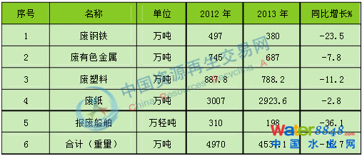截止到2013年底,我國廢鋼鐵、廢有色金屬、廢塑料、廢輪胎、廢紙、廢棄電器電子產(chǎn)品、報廢汽車、報廢船舶等八大類別的主要再生資源回收總量約為1.60億噸,同比下降0.2%。其中,降幅最大的是廢塑料,同比下降14.6%;增幅最大的廢棄電器電子產(chǎn)品,同比增長38.3%。