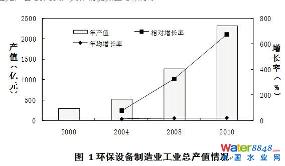由圖 1可知,“十五”和“十一五”時期,我國環(huán)保設(shè)備制造業(yè)迅速發(fā)展。2004年相對于2000年增長了76.7%,2000-2004年,環(huán)保設(shè)備制造業(yè)市場年均增長率為12.1%。進入“十一五”時期后,環(huán)保設(shè)備制造業(yè)發(fā)展速度快速增長,2008年產(chǎn)值對2000年產(chǎn)值來說,增長了3.3倍,2000-2008年,環(huán)保設(shè)備制造業(yè)市場年均增長率為17.4%;截止到2010年底,我國環(huán)保設(shè)備制造業(yè)年產(chǎn)值近2350億元,比2000年增長了6.8倍,2000-2010年年均增長率為20.5%。