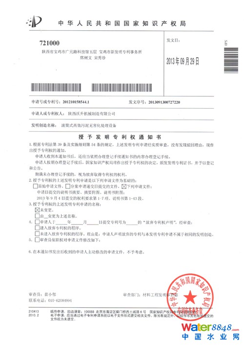 核心提示:滾筒式污泥無(wú)害化設(shè)備發(fā)明專利已經(jīng)授權(quán)