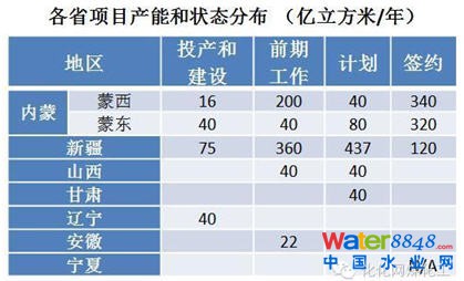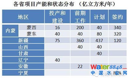 從項(xiàng)目的地理分布來看:全國計(jì)劃總產(chǎn)能2250億立方米/年中,內(nèi)蒙古分布產(chǎn)能1076億立方米,其中鄂爾多斯及周邊的蒙西地區(qū)占到596億,呼倫貝爾及周邊的蒙東地區(qū)占到480億立方米。新疆總計(jì)產(chǎn)能也達(dá)到992億立方米,其后是山西80億立方米,甘肅40億立方米,遼寧40億立方米,安徽22億立方米。