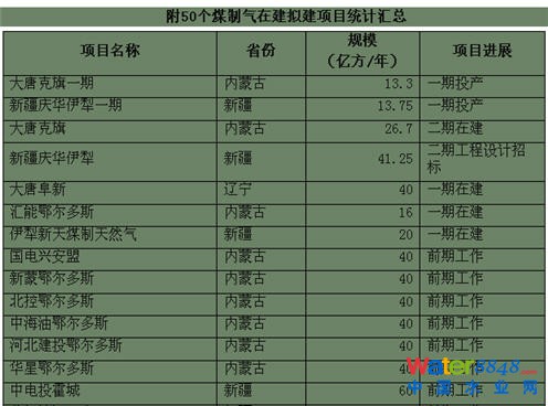 經(jīng)統(tǒng)計(jì),全國目前共有不同階段煤制氣項(xiàng)目50個(gè),其中實(shí)際建設(shè)中項(xiàng)目5個(gè)(部分產(chǎn)能已投產(chǎn)),正在做前期工作的項(xiàng)目16個(gè),計(jì)劃中的項(xiàng)目18個(gè),另有2013年以來新簽約的11個(gè)項(xiàng)目。