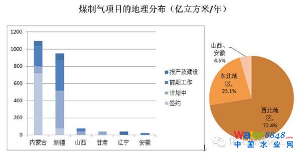 簡單計(jì)算,西北地區(qū)(新疆、蒙西和甘肅)的煤制氣計(jì)劃產(chǎn)能占到全國72.4%。