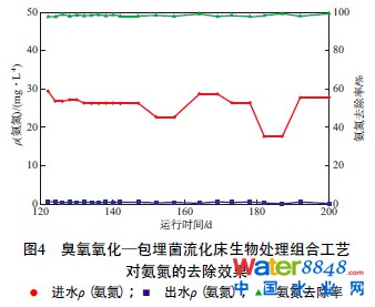 臭氧可將廢水中部分有機(jī)氮氧化成氨氮。氨氮化學(xué)穩(wěn)定性較強(qiáng),較低的臭氧加入量無法將氨氮完全氧化成硝酸鹽,使得臭氧氧化工序去除廢水中的氨氮效果不明顯,甚至出水ρ(氨氮)高于進(jìn)水[14-15]。因此,臭氧氧化—包埋菌流化床生物處理組合工藝去除廢水中的氨氮,主要依靠包埋菌流化床工序的作用。穩(wěn)定運(yùn)行下,臭氧氧化—包埋菌流化床生物處理組合工藝對(duì)氨氮的去除效果見圖4。由圖4可見,進(jìn)水ρ(氨氮)=17.6~29.4 mg/L,出水ρ(氨氮)穩(wěn)定在1.0 mg/L以下,氨氮去除率大于95.0%,證明經(jīng)過馴化的包埋菌顆粒硝化能力很強(qiáng),氨氮去除效果較好。說明將包埋菌顆粒引入到氣升式內(nèi)循環(huán)好氧流化床反應(yīng)器用于深度去除煤氣化廢水中的氨氮是有效的。