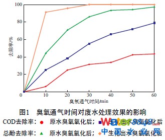 b)當(dāng)臭氧的質(zhì)量濃度20 mg/L、臭氧進(jìn)氣流量1.5 L/min、臭氧通氣時(shí)間30 min時(shí),臭氧氧化工序的COD平均去除率達(dá)到30.0%~40.0%,總酚去除率達(dá)到100.0%。